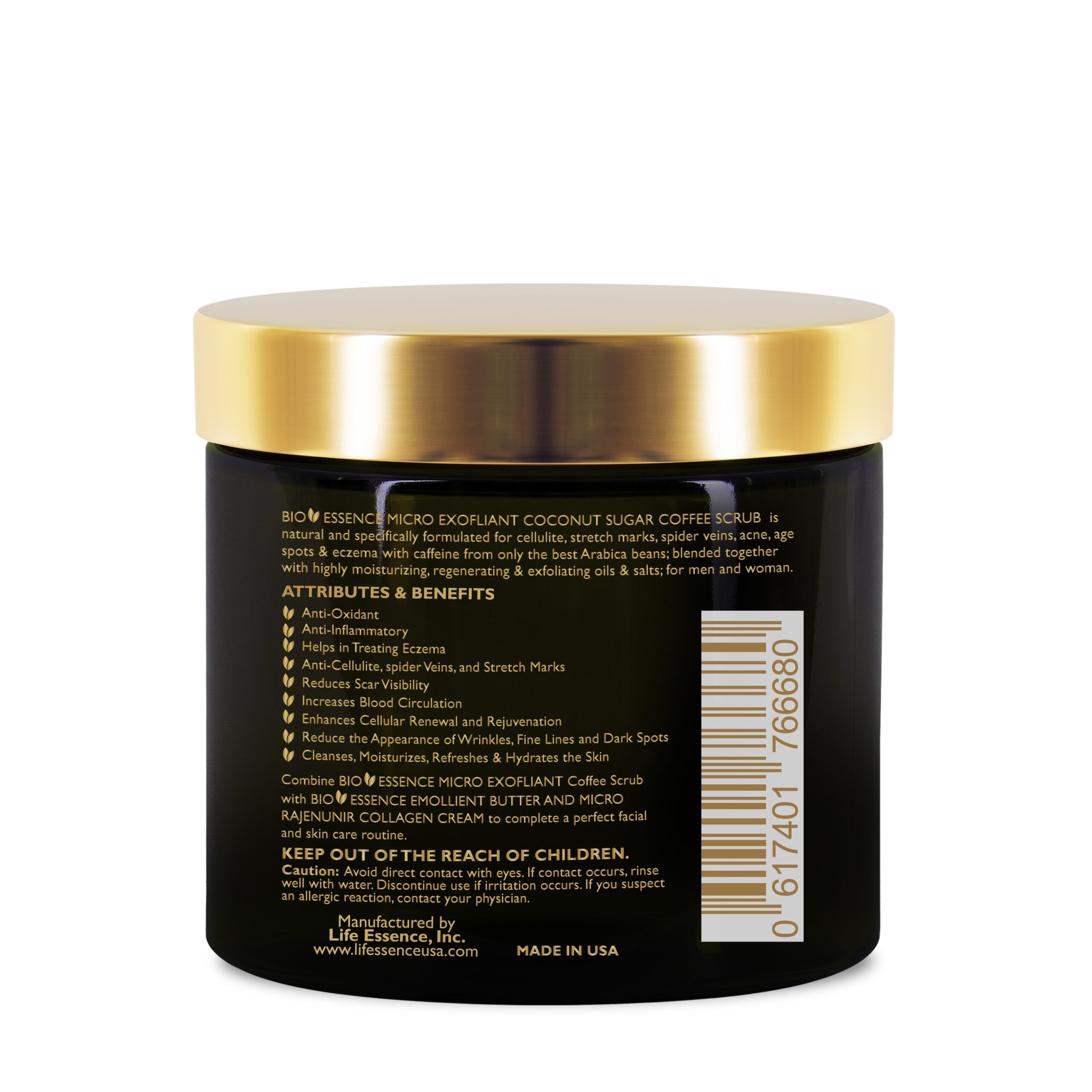 BIO Essence Micro Exfoliant Coconut Sugar Coffee Scrub is natural and specifically formulated for cellulite, stretch marks, spider veins, acne, age spots & eczema with caffeine from only the best Arabica beans; blended together with highly moisturizing, regenerating & exfoliating oils & salts. The BIO Essence Micro Exfoliant Coconut Sugar Coffee Scrub is great for men and women.